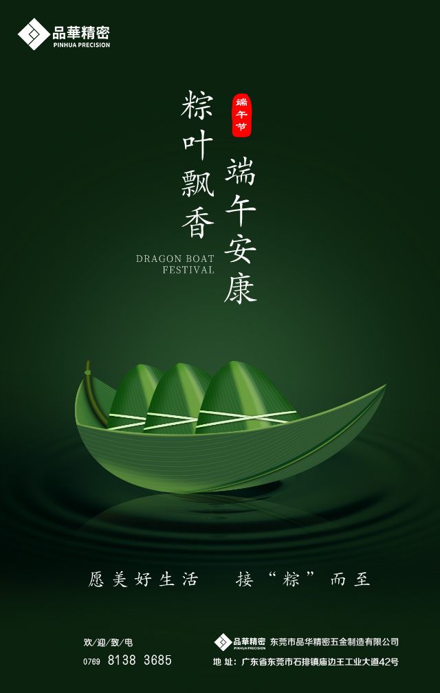 端午與春節、清明、中秋并稱為中國四大傳統節日,“端午節”這句話最開始發生于西晉的《風土記》: ”仲夏端午謂五月五日也,俗重此日也,與夏至同。”后因戰國時期的楚國詩人屈原在五月五日跳汨羅江自盡,人們亦將端午節作為紀念屈原的節日。在濃濃的粽香飄來之際,品華精密全體員工祝各位新老客戶本職工作安全,萬事如意,端午安康!